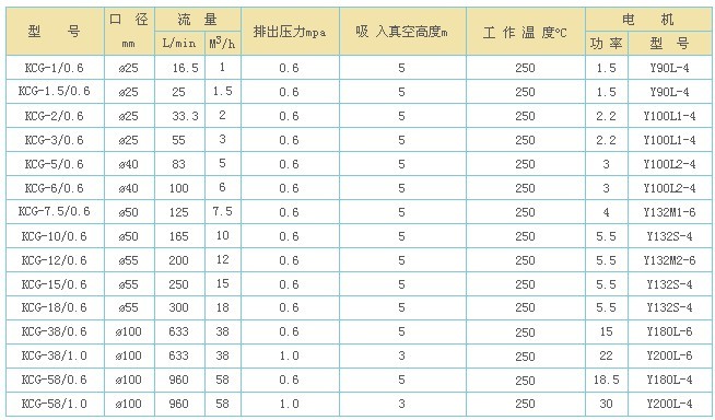 KCG高溫齒輪油泵,KCG高溫泵用途塑料橡膠加工工業(yè),紡織印染工業(yè),涂料工業(yè),木材加工工業(yè),食品業(yè)、造紙印刷等液態(tài)熱載體加熱載體加熱傳輸?shù)雀鞣N工業(yè)。 KCG高溫齒輪油泵,KCG高溫泵應(yīng)用范圍 KCG高溫齒輪油泵適用于輸送不含固體顆粒和纖維,無(wú)腐蝕性的高溫液體,介質(zhì)溫度可達(dá)250℃,粘度為5-1500cst。結(jié)構(gòu)型式 KCG高溫齒輪油泵由齒輪、軸、泵體泵蓋、軸端密封等零部件組成,所有零件均選用合適的耐溫材料制造。KCG高溫齒輪油泵,KCG高溫泵內(nèi)運(yùn)轉(zhuǎn)零件均利用其輸送的介質(zhì)潤(rùn)滑KCG高溫齒輪油泵,KCG高溫泵配有保護(hù)閥,KCG高溫齒輪油泵,KCG高溫泵可防止超載對(duì)泵和電機(jī)造成損壞。常用KCG高溫齒輪油泵性能參數(shù)表